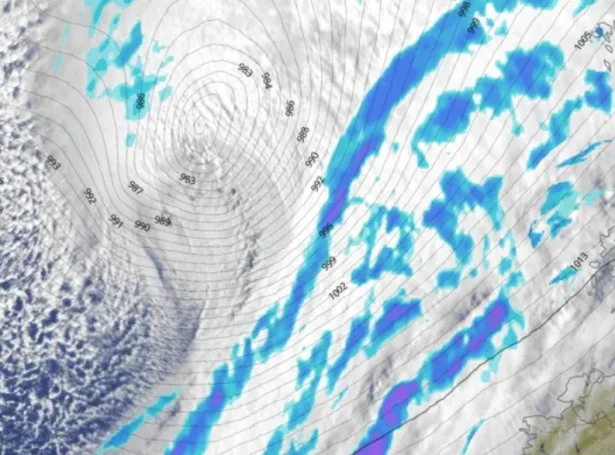 Veðurstova Føroya: Eitt lágtrýst, sum tíðliga í morgun lá eystur úr New Foundlandi, nærkast vestaneftir og fer miðdepilin eystur við Suðurlandinum í Íslandi um midnáttarleiti, og síðani eystur í Norskahav við kós móti Lofoten í Noregi. Í morgun kl 06:00 vístu forsøgnirnar um 990 hPa í miðjuni á hesum lágtrýstinum, og siga forsøgnirnar fyri kl 06:00 í morgin ári 961-965 hPa (Sí talvu 1). Tá verður hetta lágtrýstið í landsynning úr Höfn á eysturlandinum í Íslandi. Hetta gevur eitt trýstfall á 25-29 hPa, og verður sostatt innan fyri ásetingingarnar, sum eru fyri at kallað eitt lágtrýst fyri eina veðurbumbu.